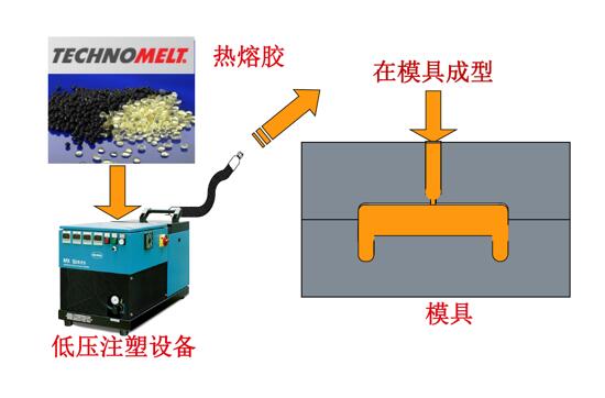 低压注塑简介- 低压注塑是低温熔化高分子产品后用较低的压力注射到模腔快速成型,为敏感电子元器件和零件提供保护的生产工艺。